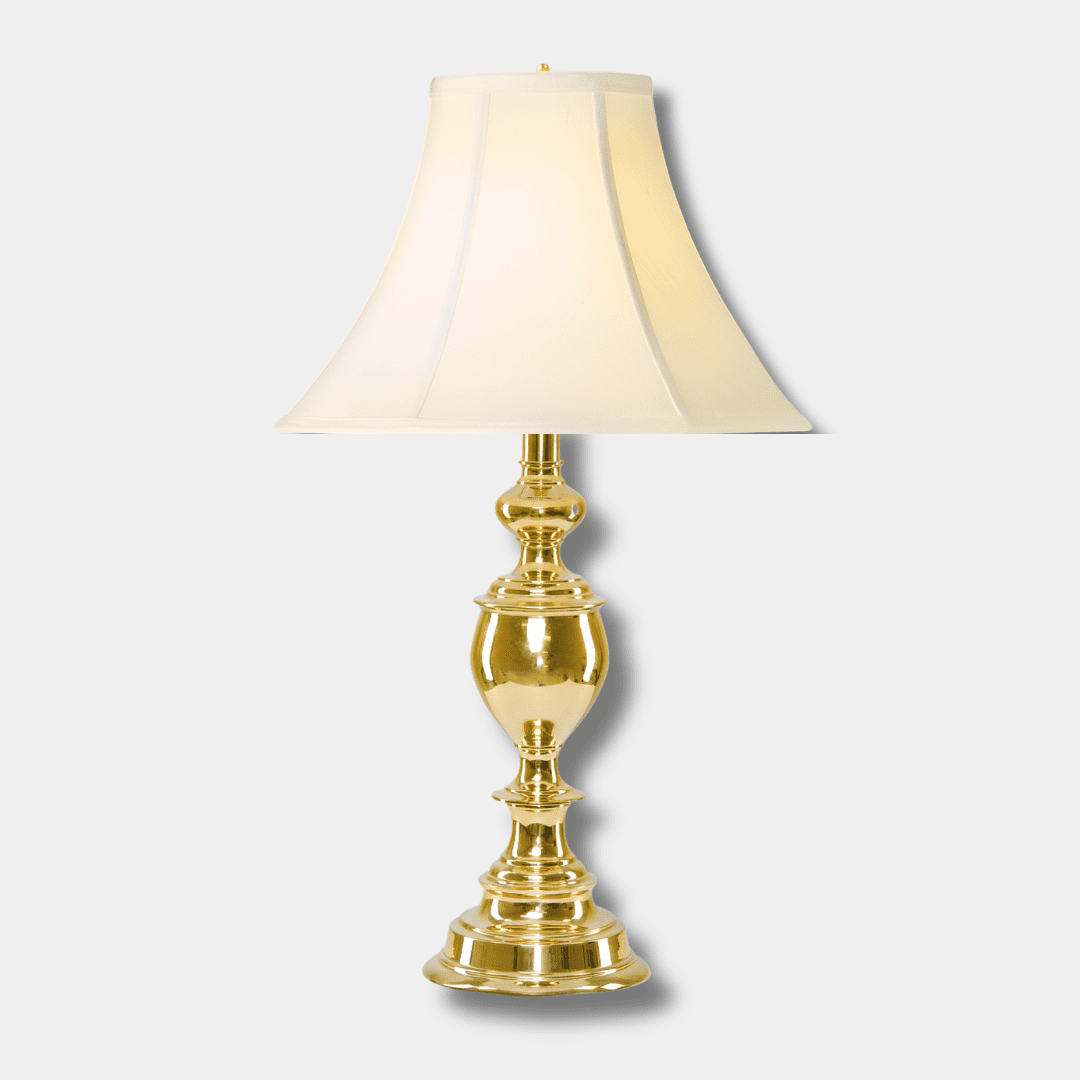 The solid brass Revere table lamp is topped with a bell shade in eggshell silk and features a traiditional design befitting any decor.